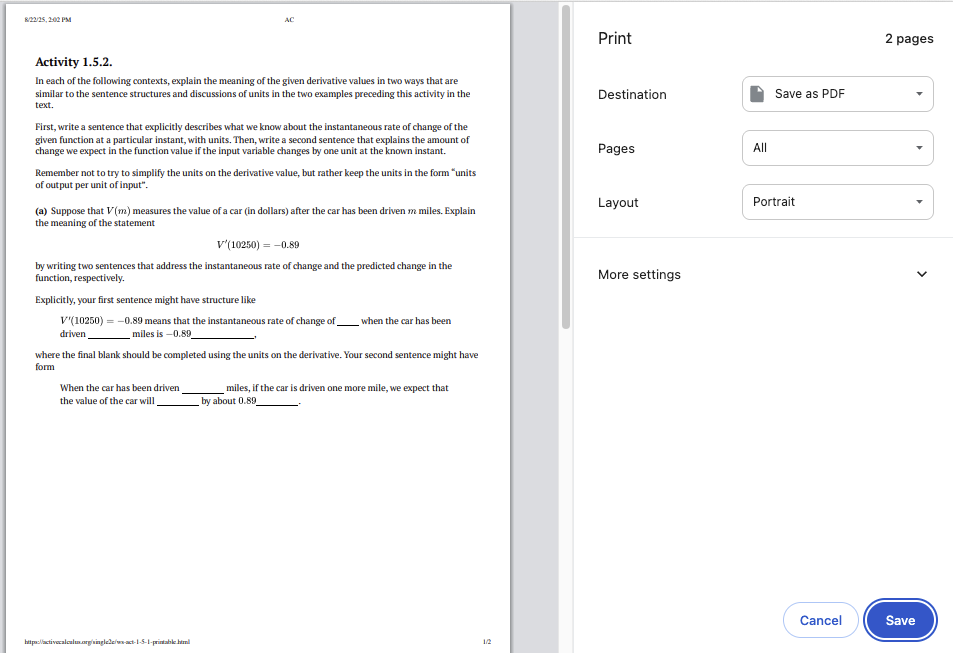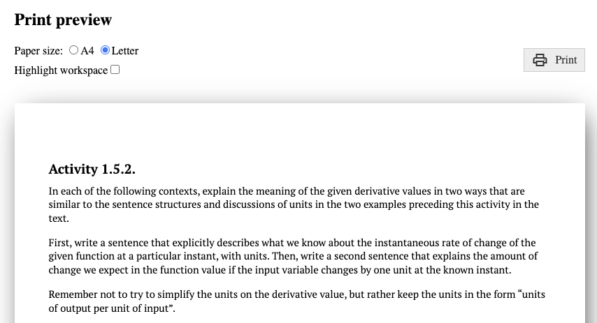 Thanks to a recent PreTeXt development, all Preview Activities and Activities in both ACS2e and APC can be printed in PDF directly from the HTML version.
