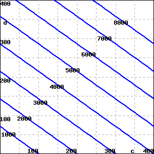 A store sells CDs at one price and DVDs at another price. The figure below shows the revenue (in dollars) of the music store as a function of the number, \(c\text{,}\) of CDs and the number, \(d\text{,}\) of DVDs that it sells. The values of the revenue are shown on each line.