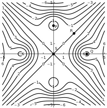 (b) Supposed that at \((6,-1)\text{,}\) we know that \(f_x=f_y=0\) and \(f_{xx} \lt 0\text{,}\)\(f_{yy} > 0\text{,}\) and \(f_{xy} = 0\text{.}\) What can we conclude about the behavior of this function near the point \((6,-1)\text{?}\)