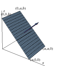Compute the flux of the vector field \(\vec{v}= -4\,\mathit{\vec i}-5\,\mathit{\vec j}-4\,\mathit{\vec k}\) through the rectangular region shown below, assuming it is oriented as shown and that \(a = 2\) and \(b = 4\text{.}\)