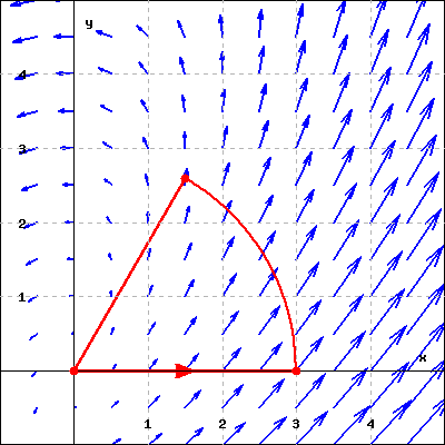 The curve \(C_2\) is the triangle with vertices \((0,0)\text{,}\)\((3,0)\text{,}\) and \((3,3)\) (oriented counterclockwise) and the vector field is \(\vG = \langle y^2, 3xy\rangle\text{.}\)