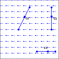 Given our motivation for calculating the work that a force field does on an object as it moves through the field, it is natural to concern ourselves with how the object moves. In particular, in many circumstances it will be different if an object moves from the point \((0,1)\) to the point \((4,3)\) by first going up the \(y\)-axis to \((0,3)\) and then moving horizontally to \((4,3)\) (illustrated by \(C_1\) in FigureΒ 12.2.2) than if the object moves along the line segment from \((0,1)\) directly to \((4,3)\)(illustrated by \(C_2\) in FigureΒ 12.2.2). Similarly, given a fixed force field, we would expect the work done to be different (in fact, opposite) if the object moves from \((4,3)\) to \((0,1)\) directly along a line segment (\(C_3\) in FigureΒ 12.2.2). We say that a curve in \(\R^2\) or \(\R^3\) is oriented if we have specified the direction of travel along the curve. When a curve is given parametrically (including as a vector-valued function), our convention will be that the orientation follows from the smallest allowable value of the parameter to the largest.