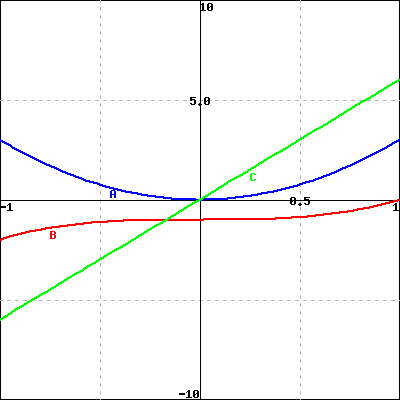 Identify the graphs A (blue), B( red) and C (green) as the graphs of a function and its derivatives:
