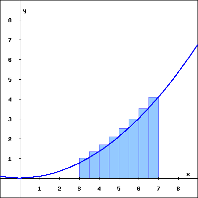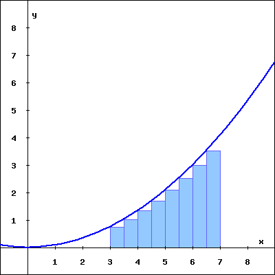 The rectangles in the graph below illustrate a right endpoint Riemann sum for \(\displaystyle f(x) = \frac{x^{2}}{12}\) on the interval \(\lbrack 3, 7 \rbrack\text{.}\)