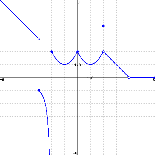 The function \(f\) given in the figure in Preview Activity 1.7.1 fails to have a limit at only two values: at \(a = -2\) (where the left- and right-hand limits are 2 and \(-1\text{,}\) respectively) and at \(x = 2\text{,}\) where \(\lim_{x \to 2^+} f(x)\) does not exist. Note well that even at values such as \(a = -1\) and \(a = 0\) where there are holes in the graph, the limit still exists.