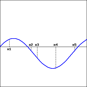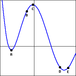 At exactly two of the labeled points in the figure below, which shows a function \(f\text{,}\) the derivative \(f'\) is zero; the second derivative \(f''\) is not zero at any of the labeled points. Select the correct signs for each of \(f\text{,}\)\(f'\) and \(f''\) at each marked point.