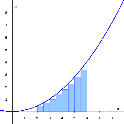 The rectangles in the graph below illustrate a left endpoint Riemann sum for \(\displaystyle f(x) = \frac{x^{2}}{9}\) on the interval \(\lbrack 2, 6 \rbrack\text{.}\)